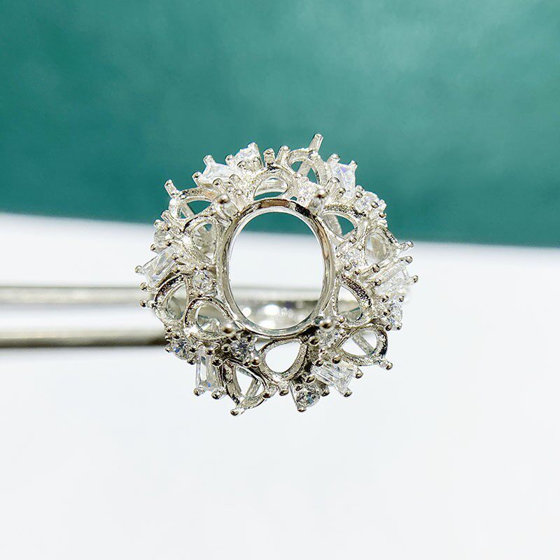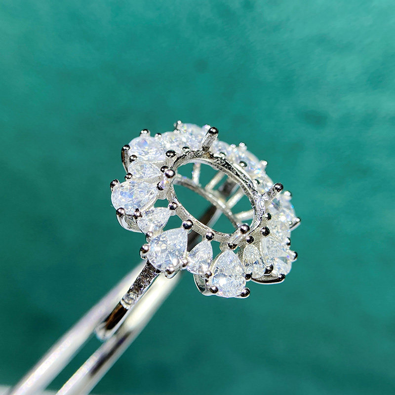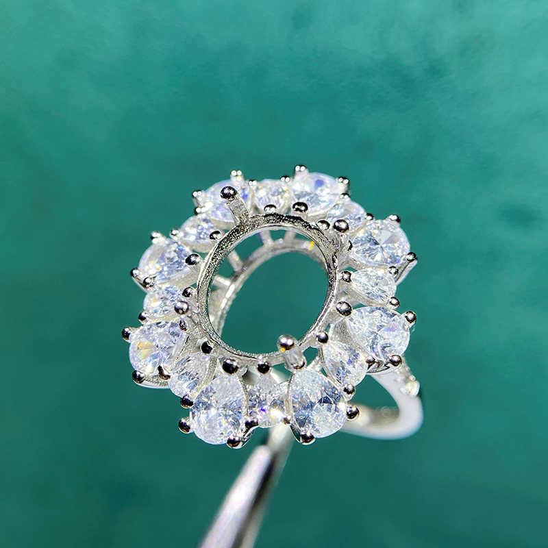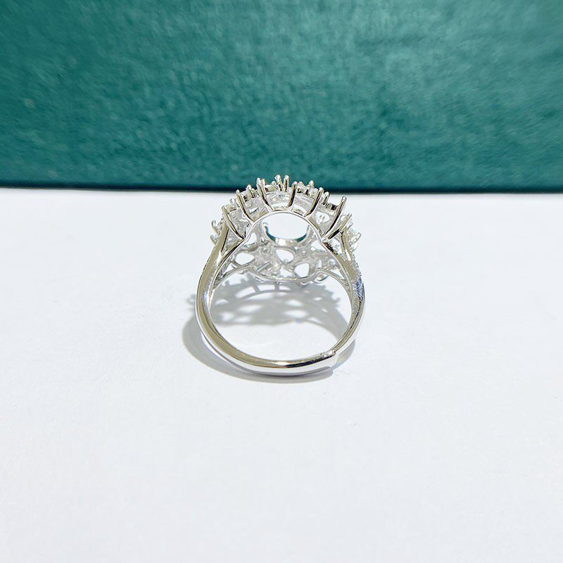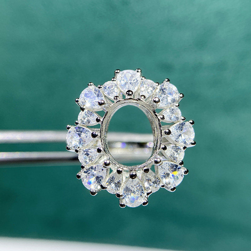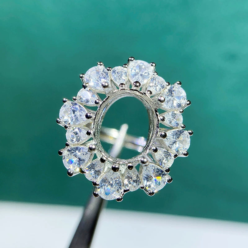 This adjustable cluster ring setting is crafted from high-quality S925 sterling silver and features an 8×10mm oval main stone setting with 3×4mm teardrop accent settings. The open-ring design allows flexible sizing, making it perfect for DIY jewelry making and custom gemstone mounting.